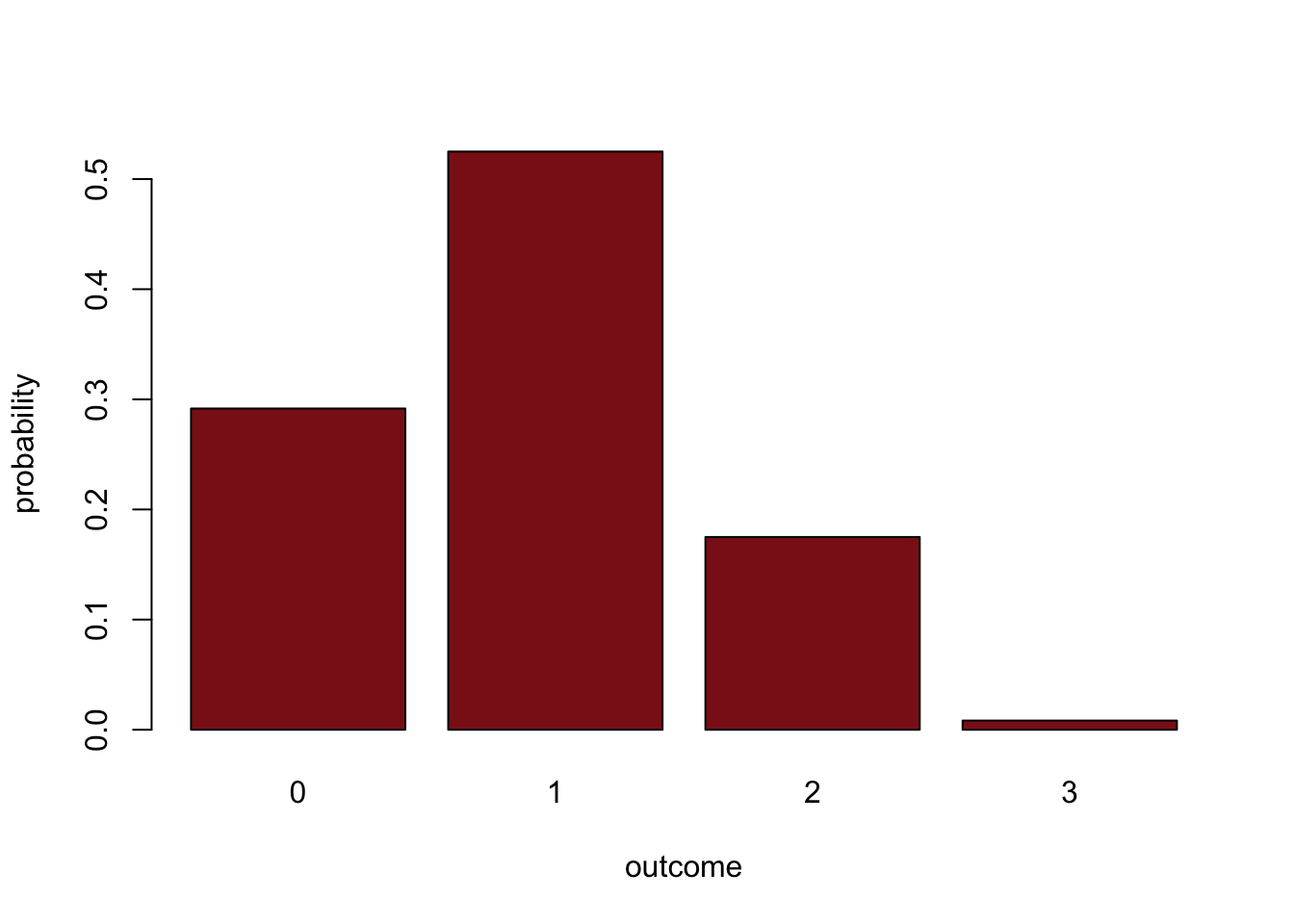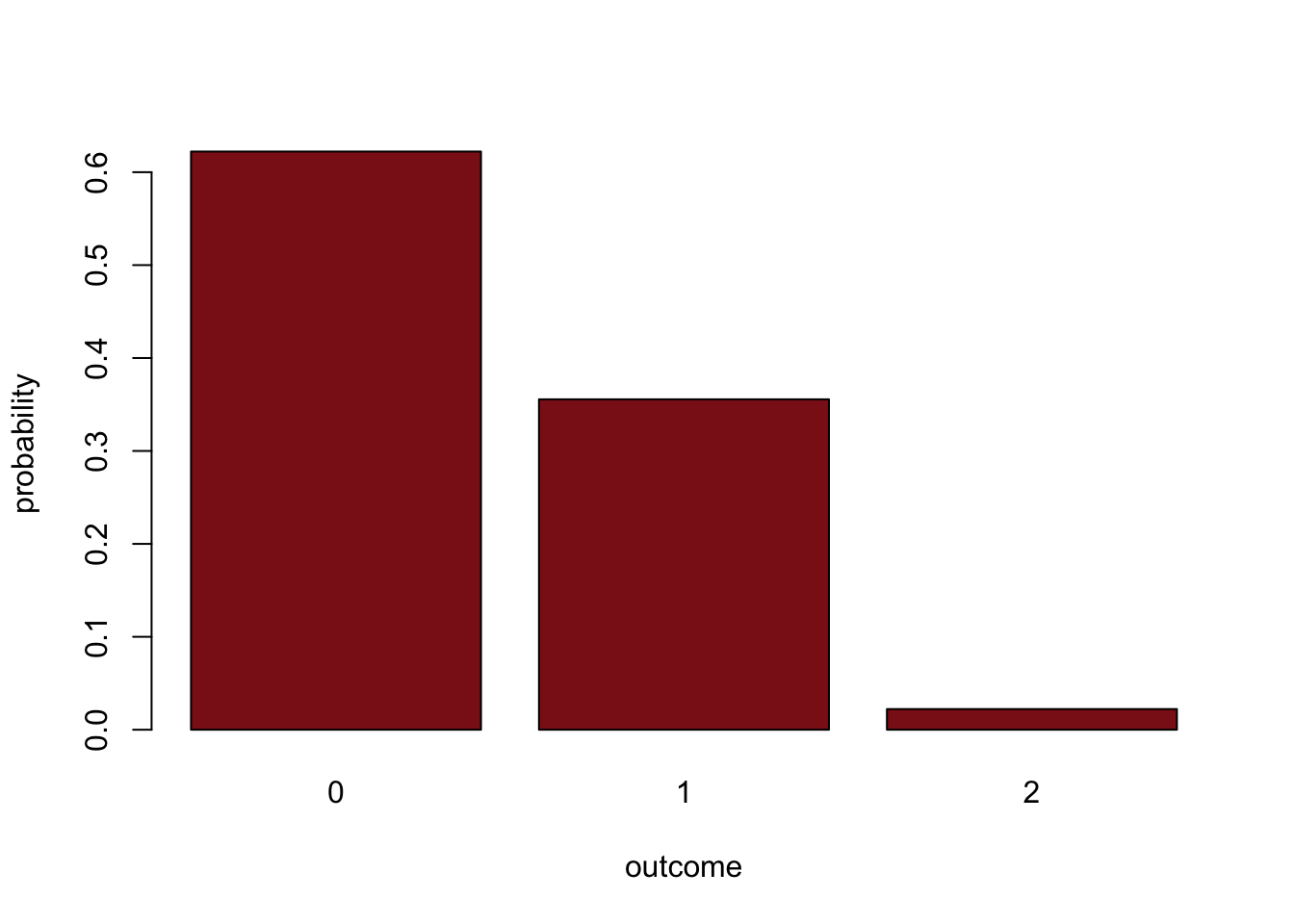 barplot(ph, names=(0:n), col="firebrick4", xlab="outcome", ylab="probability")