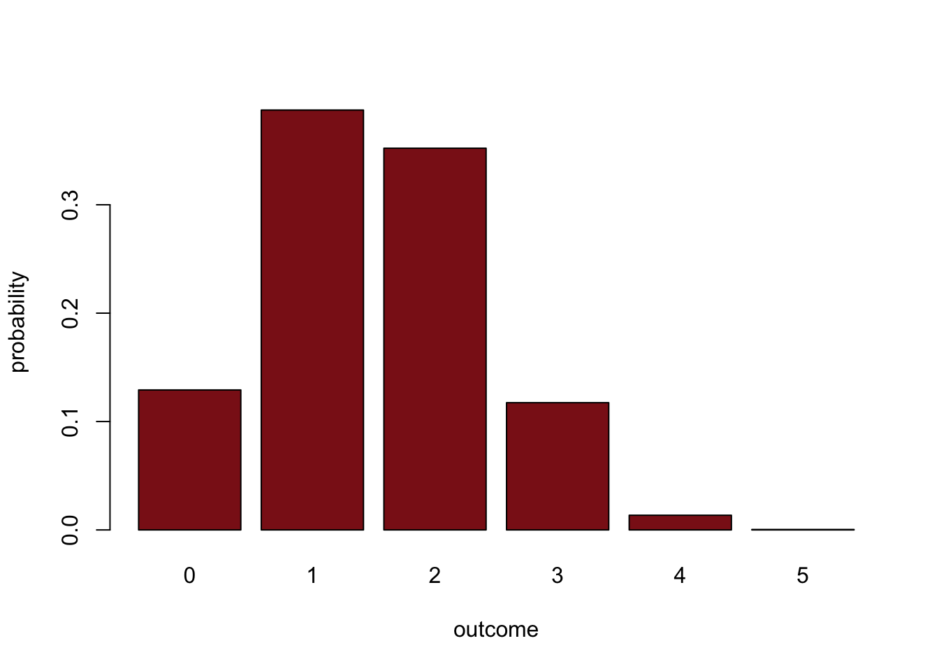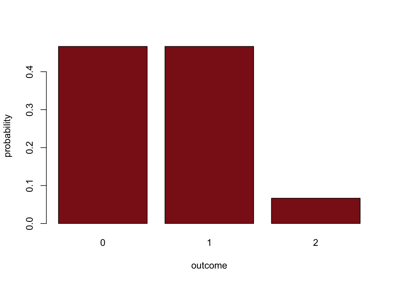 barplot(ph, names=(0:n), col="firebrick4", xlab="outcome", ylab="probability")
