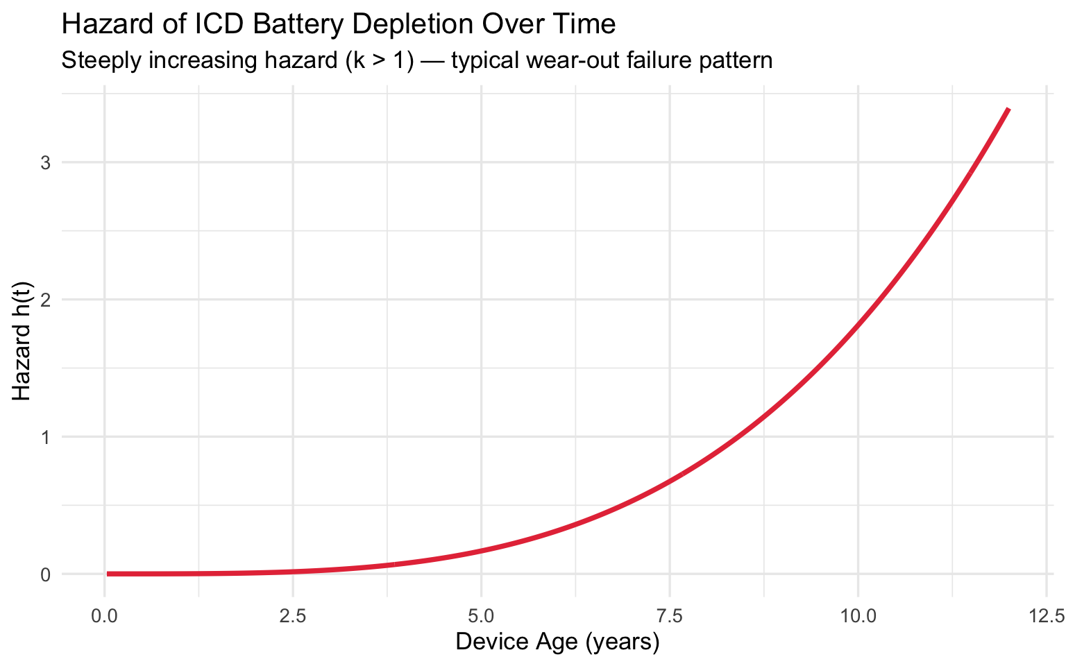subtitle = "Steeply increasing hazard (k > 1) — typical wear-out failure pattern",