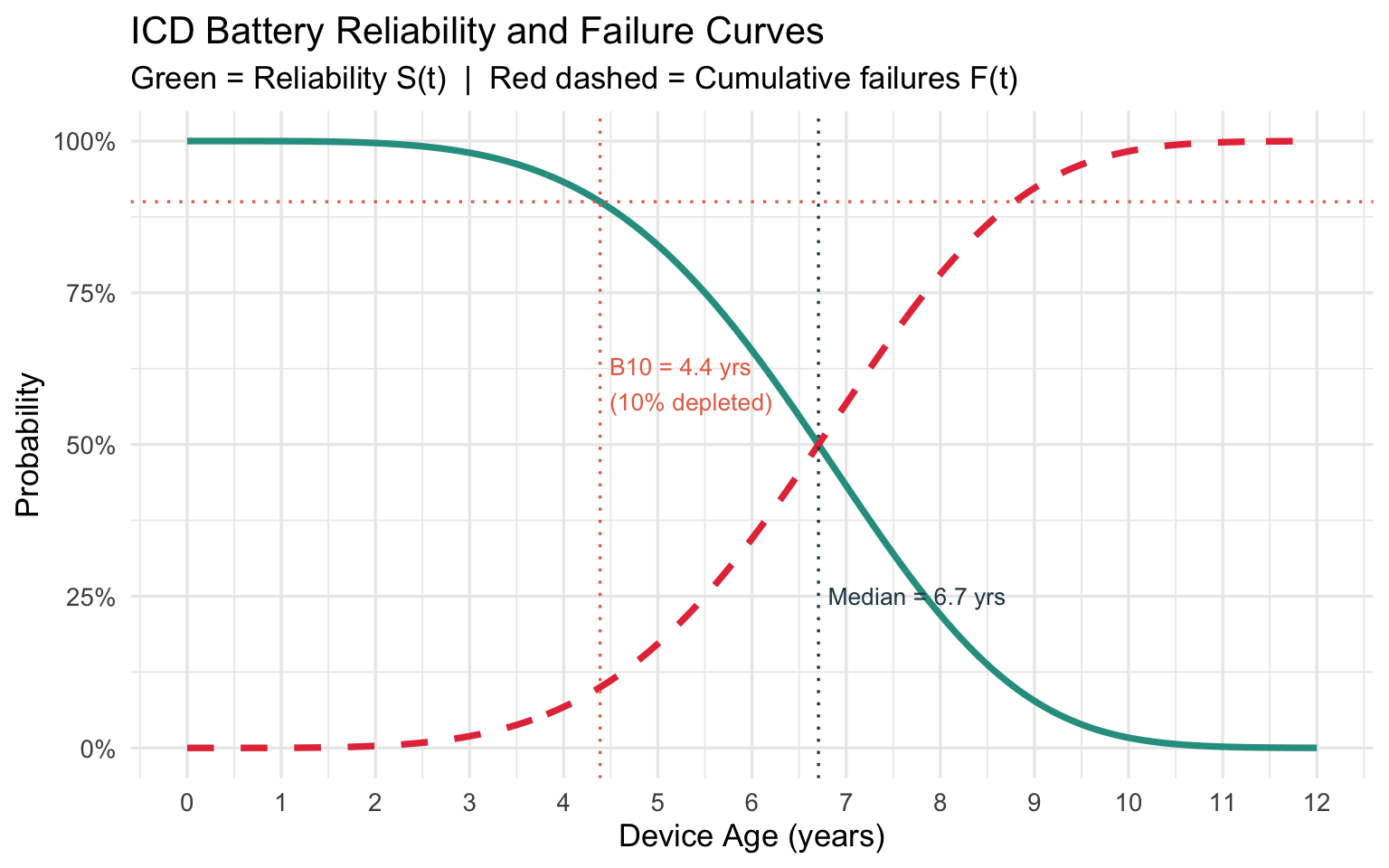 | ICD Battery | ~4.5 | Steeply increasing | Depletion risk rises sharply with device age | B10 life, MTTF, surgical load |