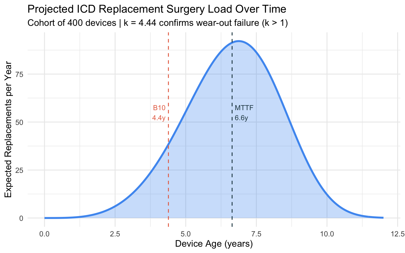 Clinical takeaway: With B10 life at 4.4 years, elective replacement interval (ERI) alerts should activate before this threshold. The steeply rising hazard (\(k \approx 4.5\)) means that once batteries start depleting in a cohort, the surgical workload accumulates rapidly — informing how many electrophysiology slots to reserve.
