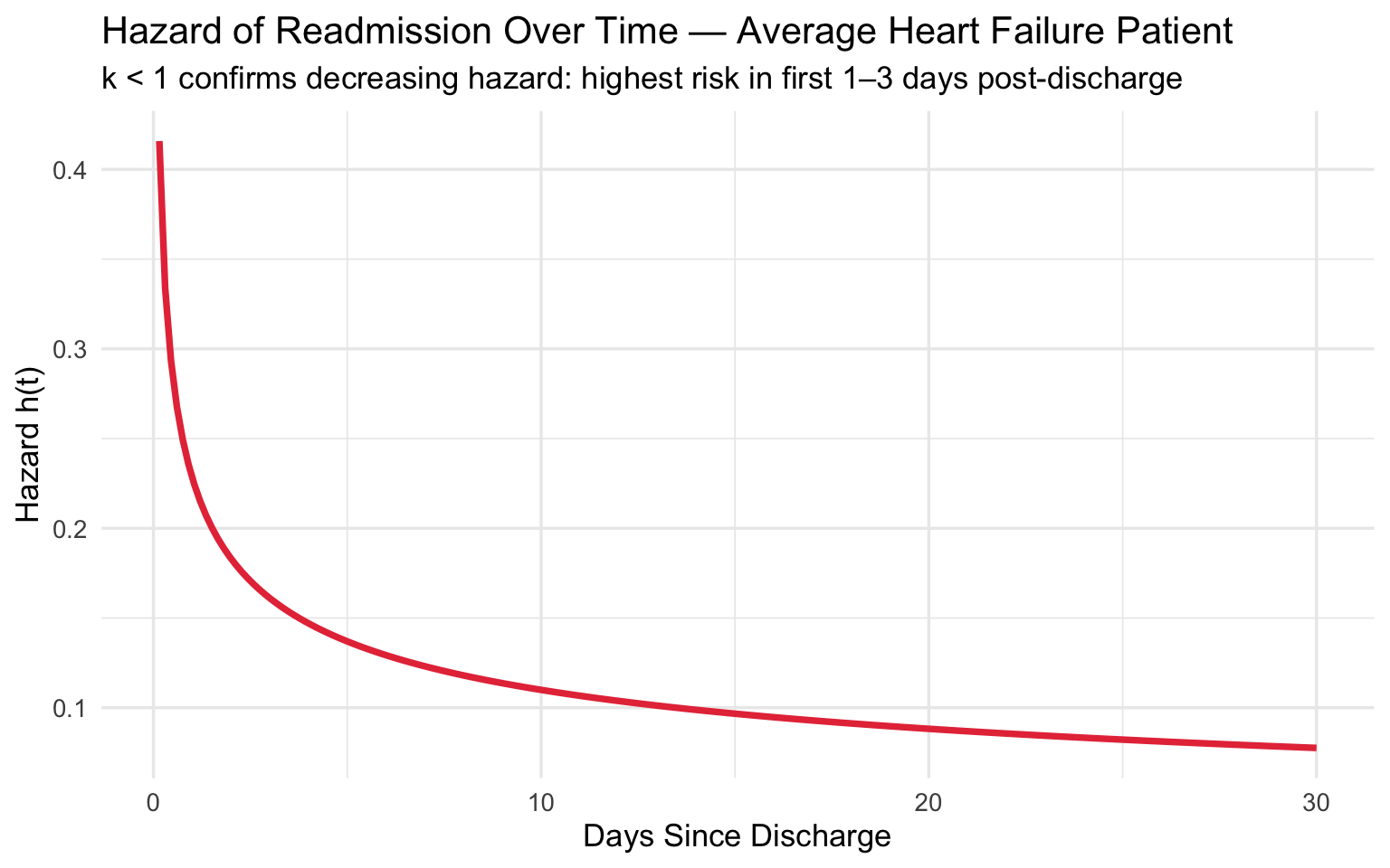 | HF Readmission | ~0.7 | Decreasing | Readmission risk highest right after discharge | B10 = 10% readmitted by day X |